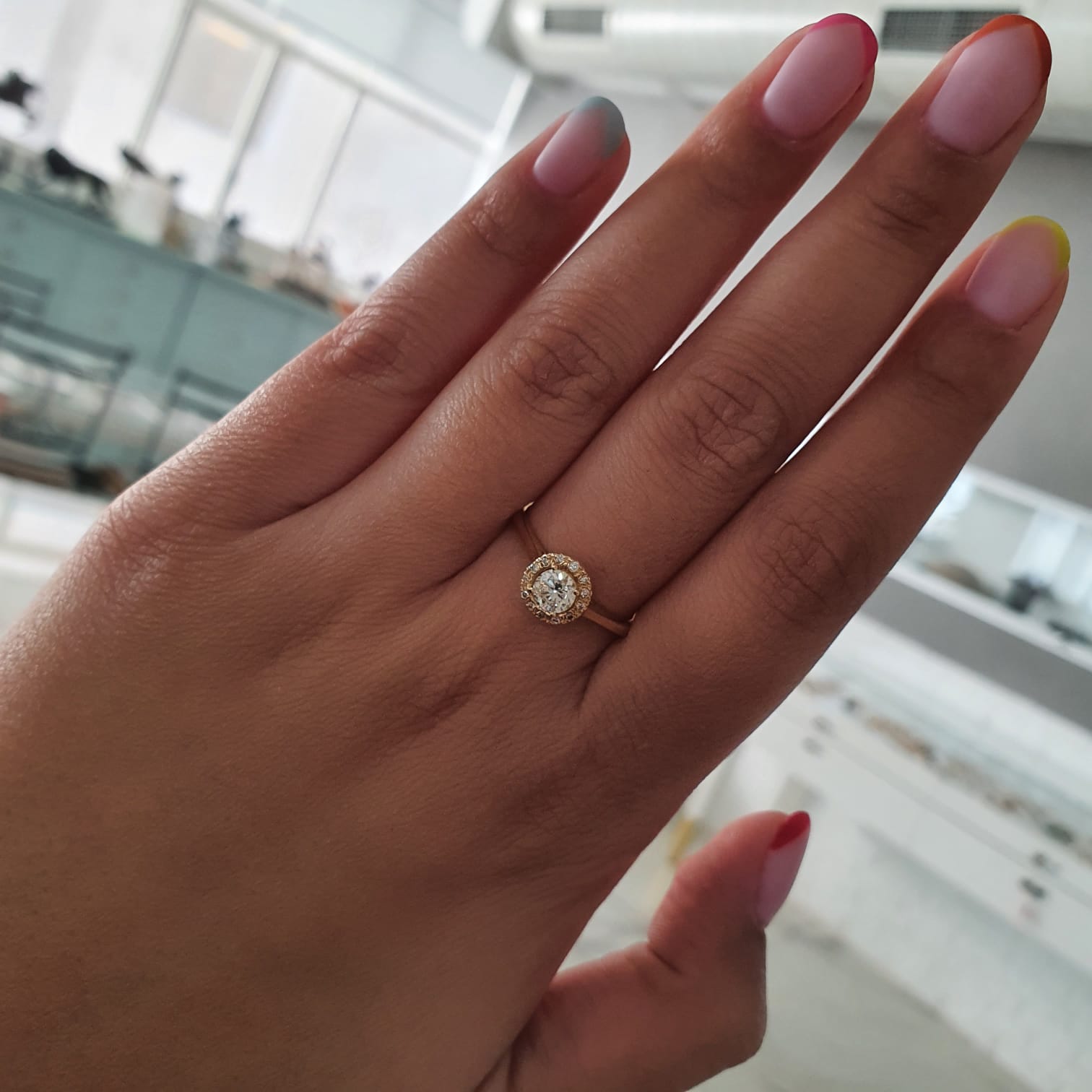 | טבעת מיוחדת על שמה "האלו" יהלום מרכזי ומסביבו יהלומים נוספים שיוצרים הילה.הערכת מחיר לפי IGL 8,110 ש"ח |