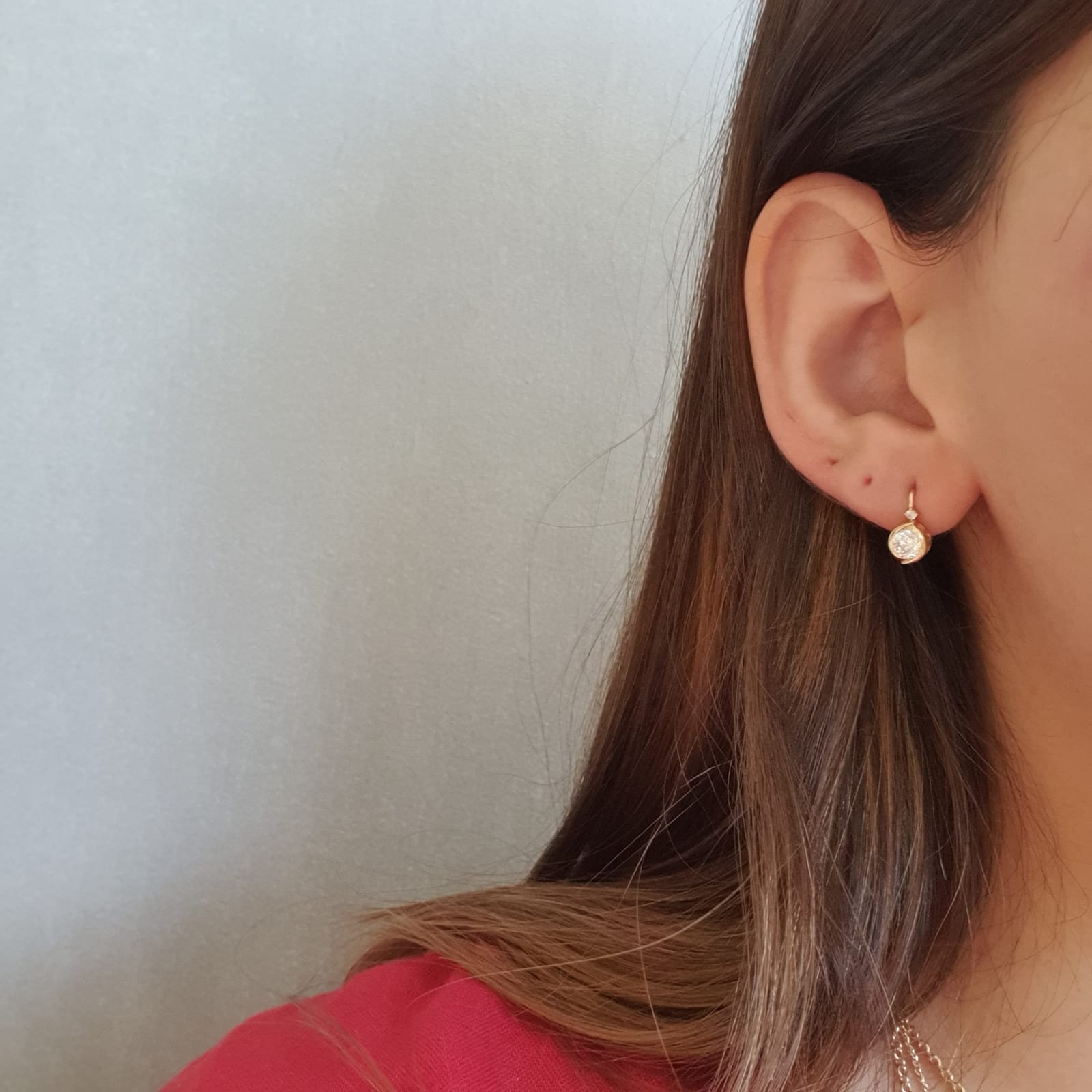 עגילי זהב צמודים ונתלים עשויים בעבודת יד, משובצים אבן זרקון לבנה שקופה ממוסגרת על ידי מסגרת זהב.
