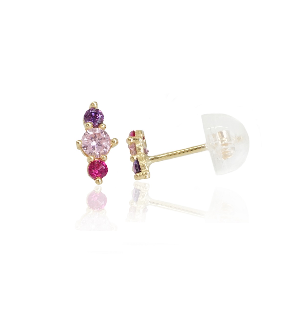 | עגילי זהב 14קרט צמודים לאוזן. עגילי 3 אבנים בורוד, סגול וורוד בהיר. עגילים חמודים לילדה |