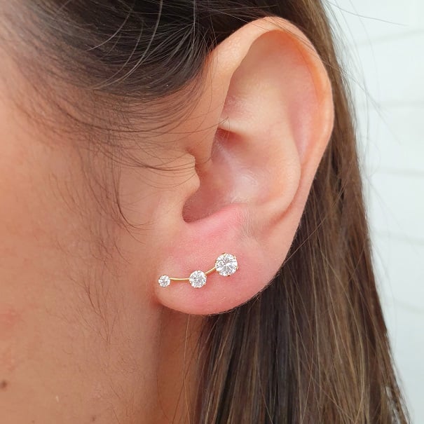 | עגילי זהב K14 צמודים לאוזן. עגילים אופנתיים ומלאים שיק , העגילים משובצים 14 אבני זרקון נוצצים, לבנים ושקופים | |