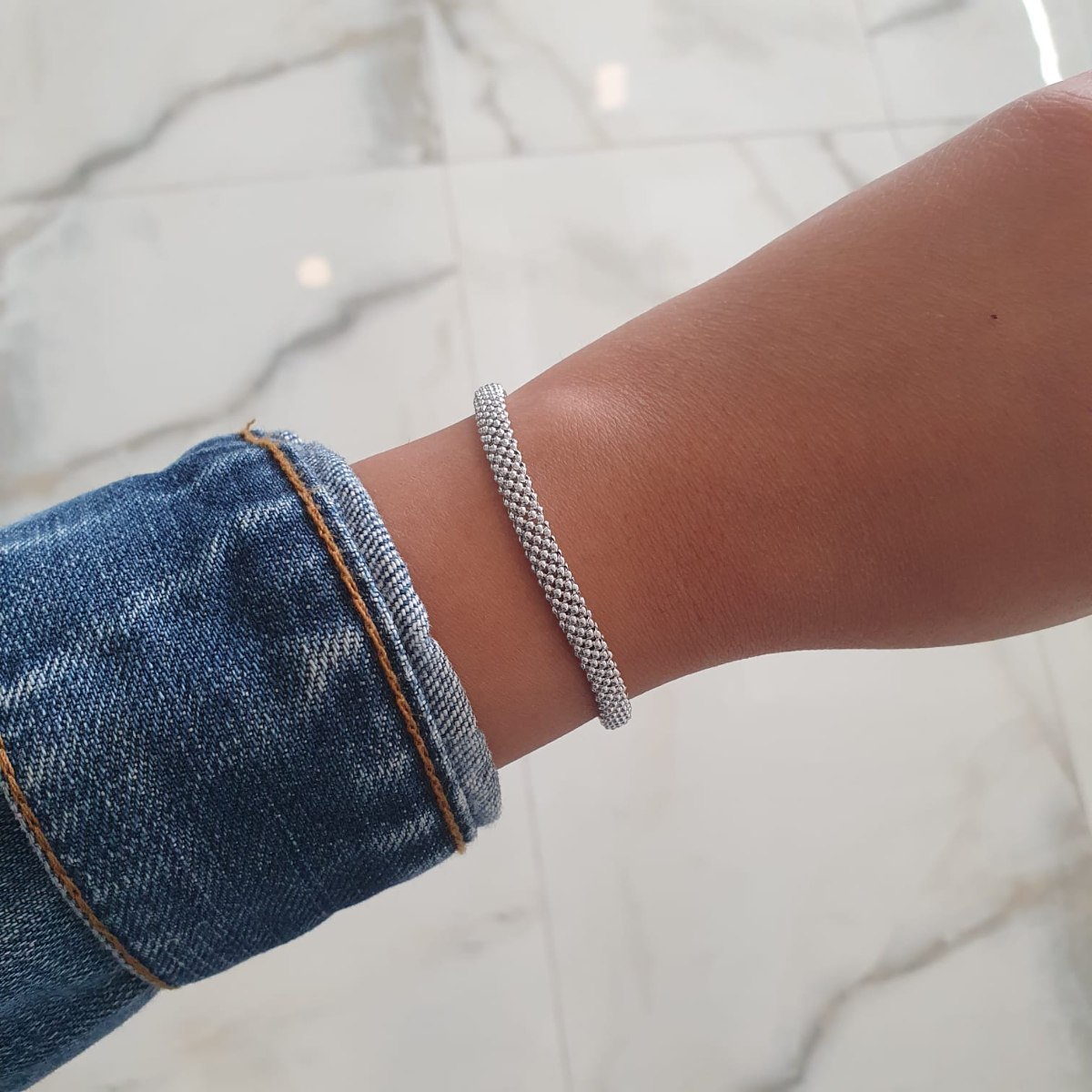 | תיאור צמיד זהב 14 קראט. צמיד זהב לבן דגם פופקורן. צמיד יפהפה, זוהר ומתאים ליום יום ולערב. |