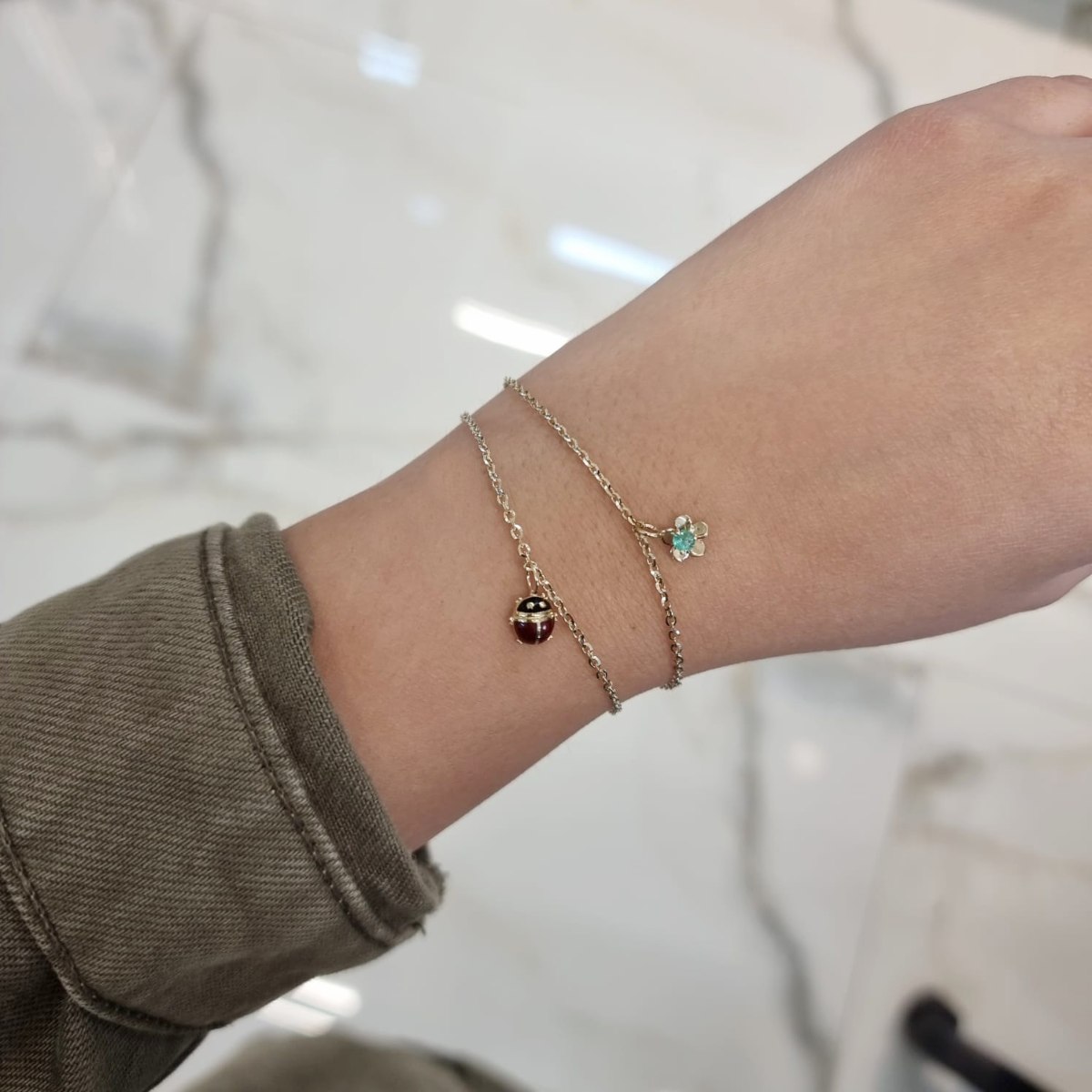 | תיאור צמיד זהב 14 קראט עם צ'ארם פרח ואבן אמרלד. תכשיט מהמם ומלא בסטייל! צמיד אלגנטי, משגע ויתאים, לאירוע או ליום יום. |